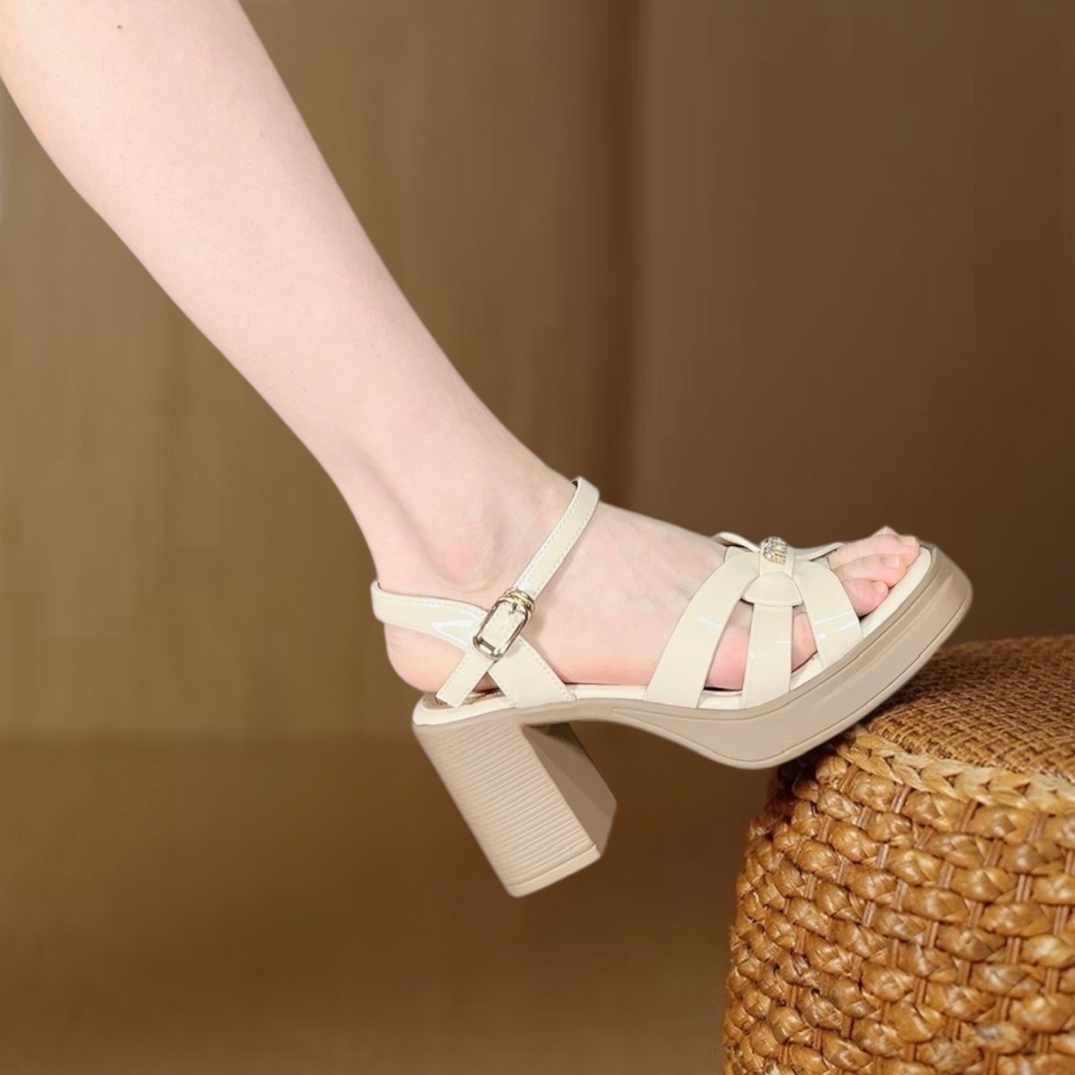 簡約漆皮粗跟涼鞋 米白/黑